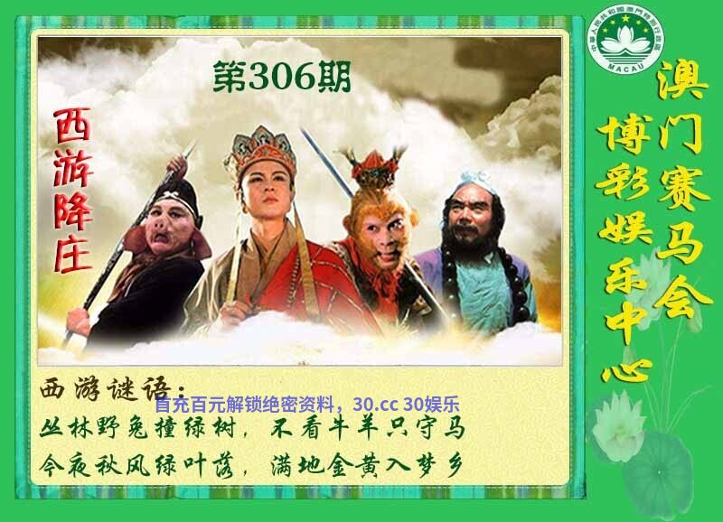 306期西游记: 丛林野兔撞绿树,不看牛羊只守马 今夜秋风绿叶落,满地金黄入梦乡 解析:绿树解得绿肖牛羊龙狗。明肖牛羊马兔,今夜解得晚上生肖,秋风解得秋肖猴狗鸡;绿叶解得绿肖牛羊龙狗;金黄解得金肖猴鸡 综合七肖:牛羊龙狗马兔鸡 综合五肖:牛羊龙狗马 综合三肖:牛羊龙 |