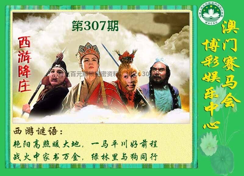 307期西游记: 艳阳高照暖大地,一马平川好前程 战火中家书万金,绿林里与狗同行 解析:艳阳高照解得阳肖鸡兔牛羊虎猴;好前程解得前肖;综合得兔牛虎,战火解得火肖蛇马,绿林绿肖羊龙牛狗,明肖狗 综合七肖:兔牛虎蛇马龙狗 |